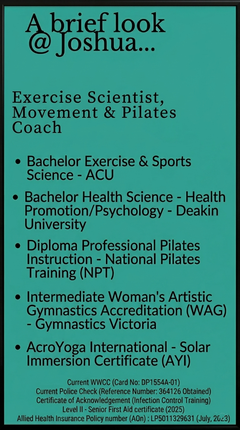 From elite-level gymnastics coaching to clinical Pilates and NDIS capacity building, Joshua specializes in turning complex physical challenges into sustainable, empowered movement. Whether you are navigating a clinical recovery or looking to master your body's full potential, you are in the hands of a professional committed to your long-term autonomy and strength.